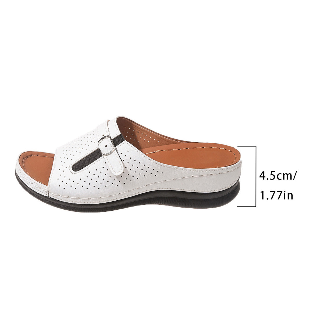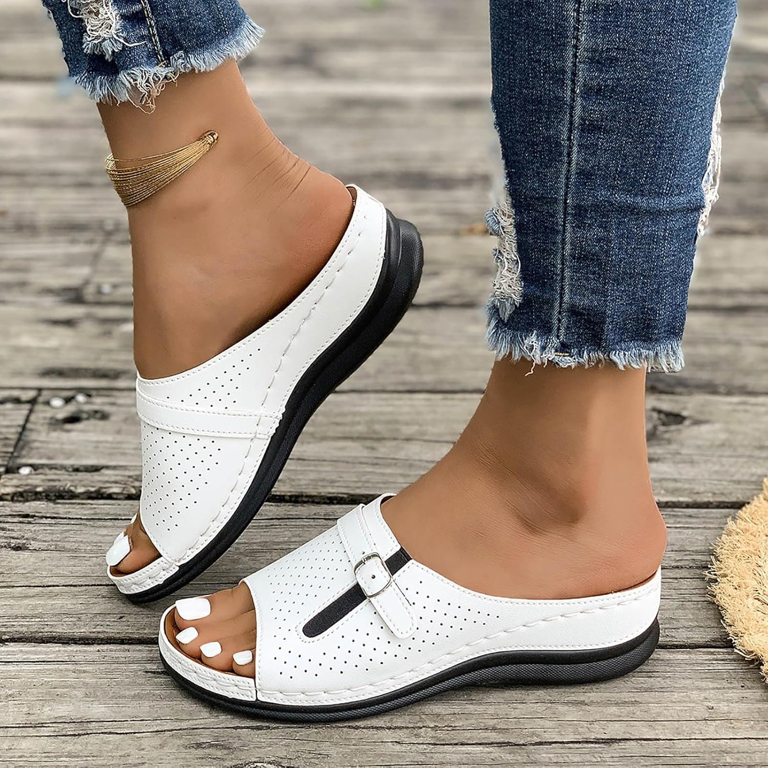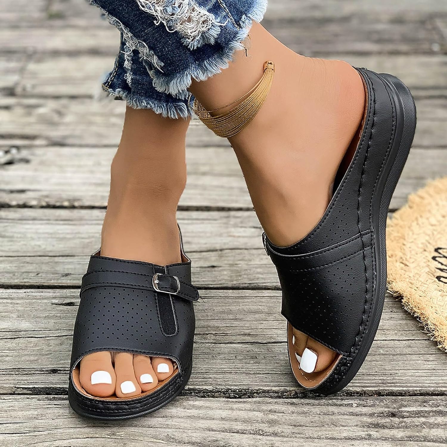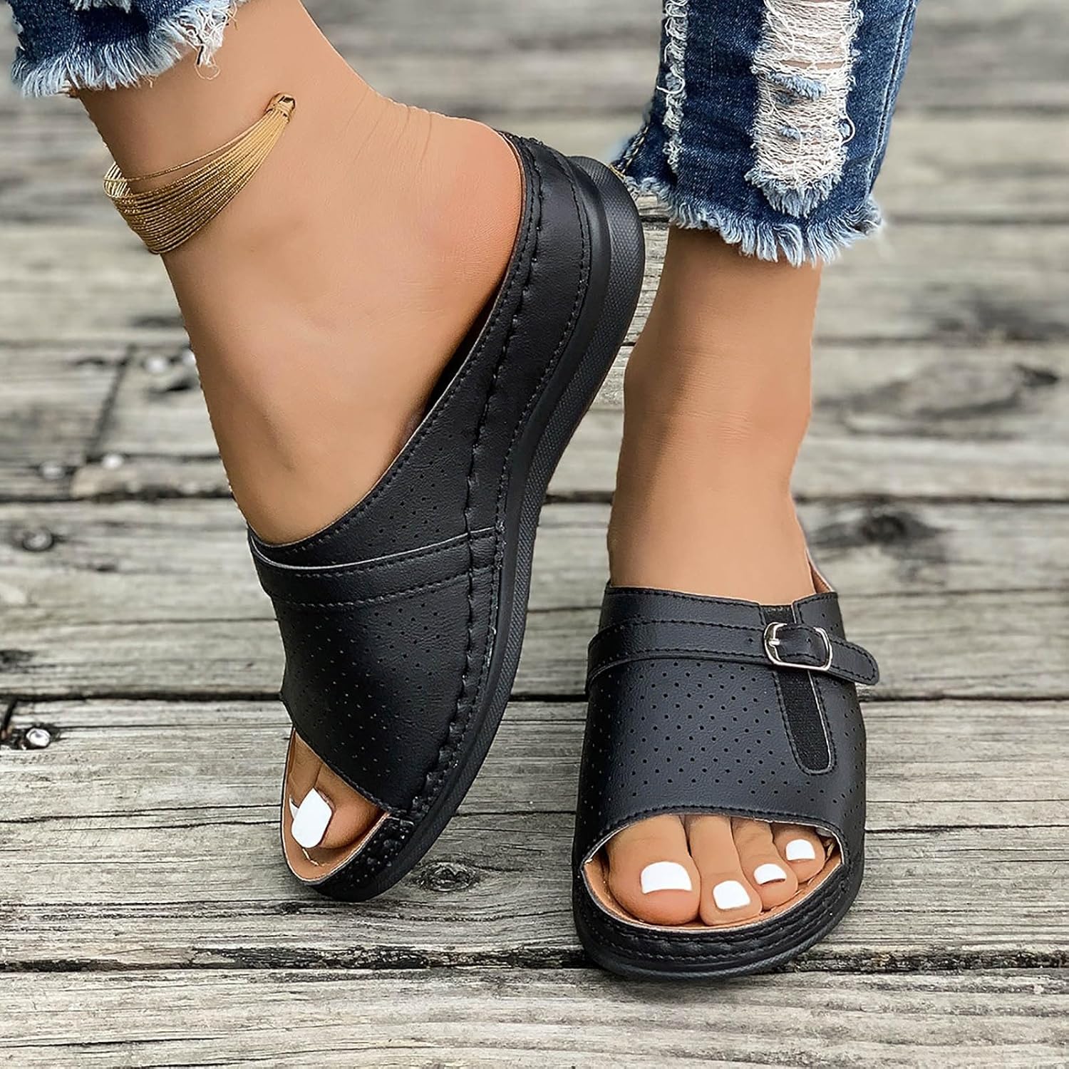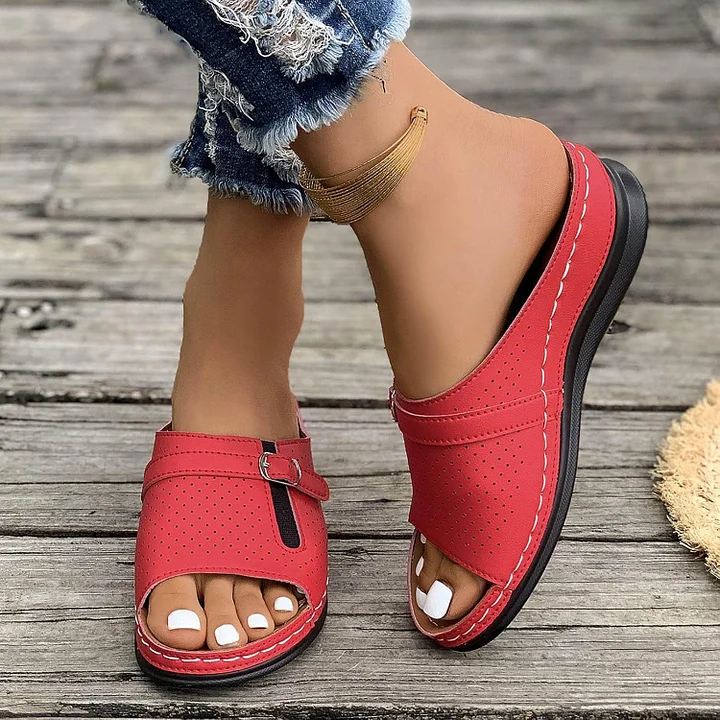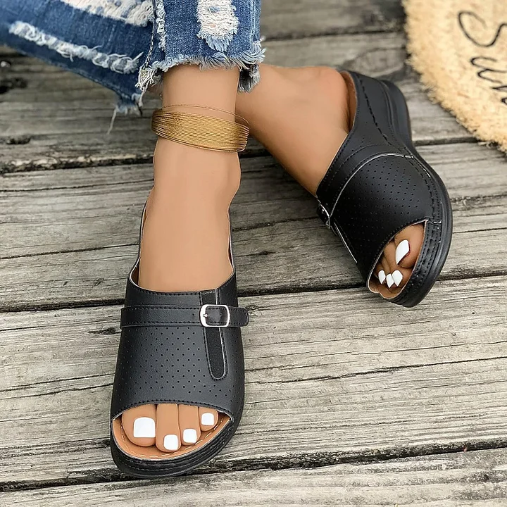 Podwyższona pięta klinowa: Sandał ten ma podwyższoną piętę klinową, która poprawia zarówno styl, jak i stabilność. Obcina Wedge jest modnym wyborem dla tych, którzy pragną mieszanki elegancji i wygody. Oferuje szerszą bazę niż szpilka, rozkładając ciężar użytkownika bardziej równomiernie na stopie, co pomaga zmniejszyć odkształcenie stopy i nogi podczas dłuższego zużycia. To sprawia, że jest to idealna opcja na letnie wyjścia lub wakacje na plaży, w których komfort jest najważniejszy.