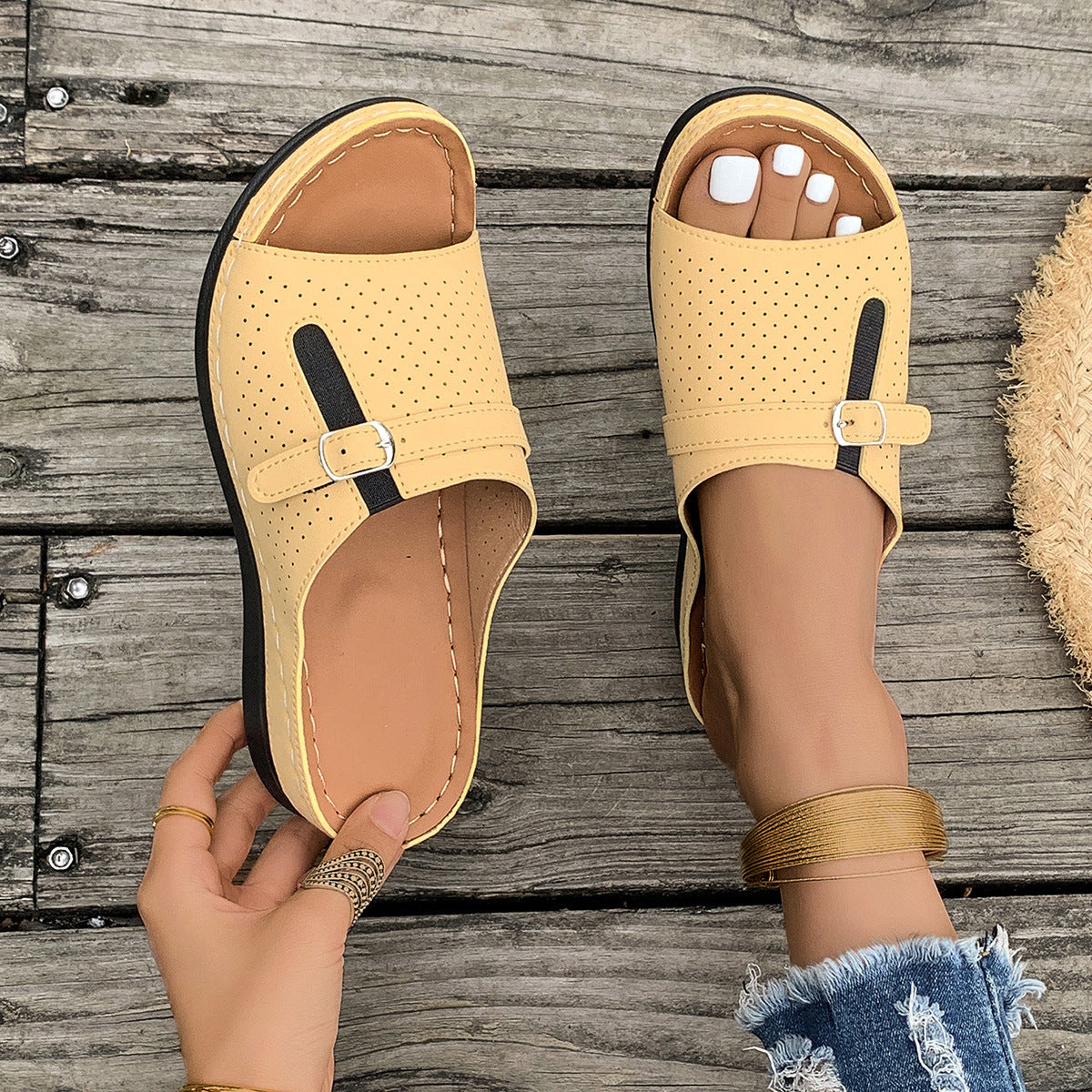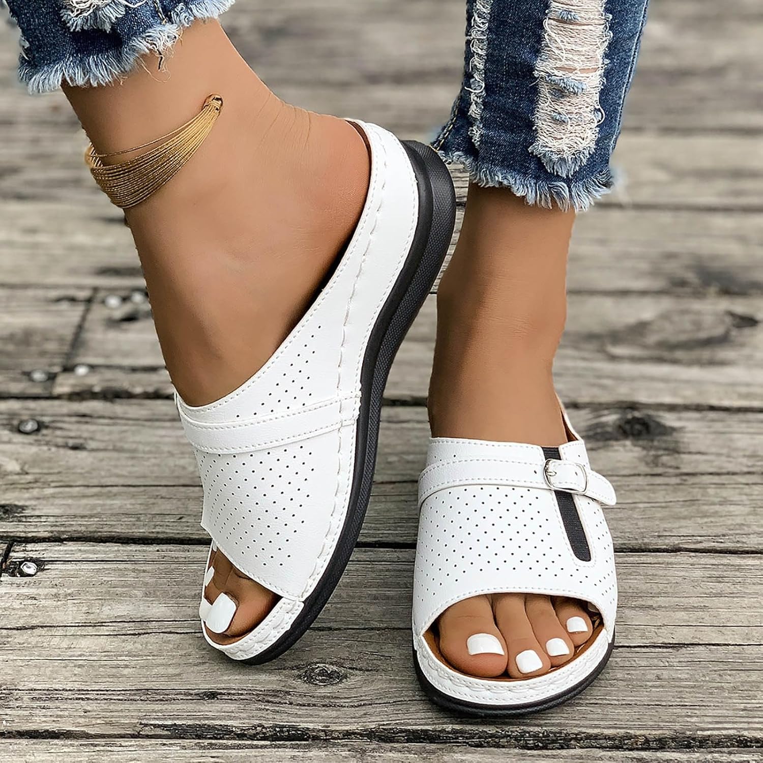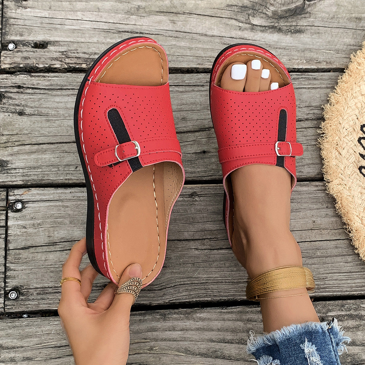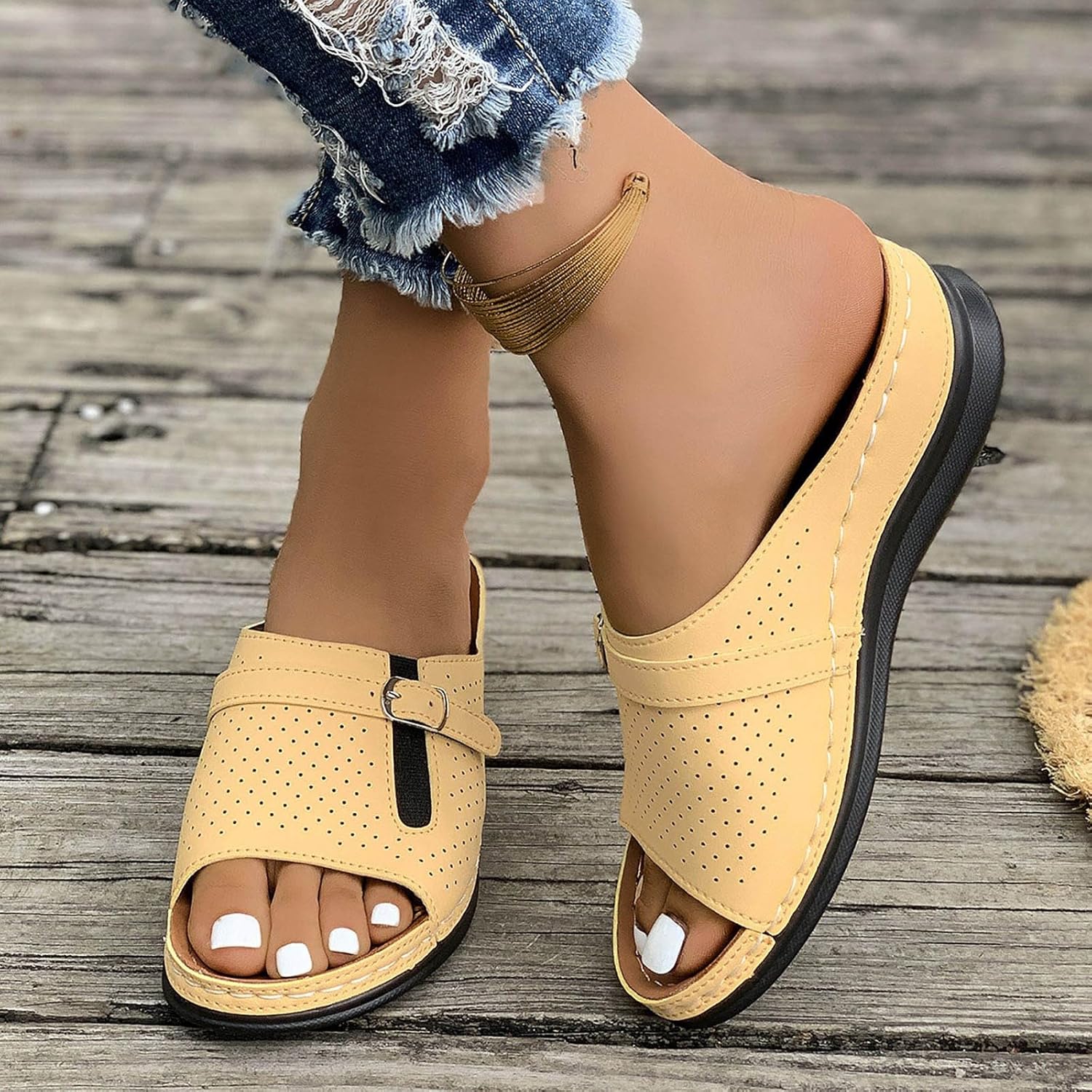 Podwyższona pięta klinowa: Sandał ten ma podwyższoną piętę klinową, która poprawia zarówno styl, jak i stabilność. Obcina Wedge jest modnym wyborem dla tych, którzy pragną mieszanki elegancji i wygody. Oferuje szerszą bazę niż szpilka, rozkładając ciężar użytkownika bardziej równomiernie na stopie, co pomaga zmniejszyć odkształcenie stopy i nogi podczas dłuższego zużycia. To sprawia, że jest to idealna opcja na letnie wyjścia lub wakacje na plaży, w których komfort jest najważniejszy.