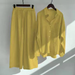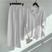 Obejmuje klasyczną bluzkę z krótkim rękawem i okrągłym dekoltem oraz spodnie z szerokimi nogawkami i elastycznym paskiem zapewniającym wygodne, płaskie dopasowanie.