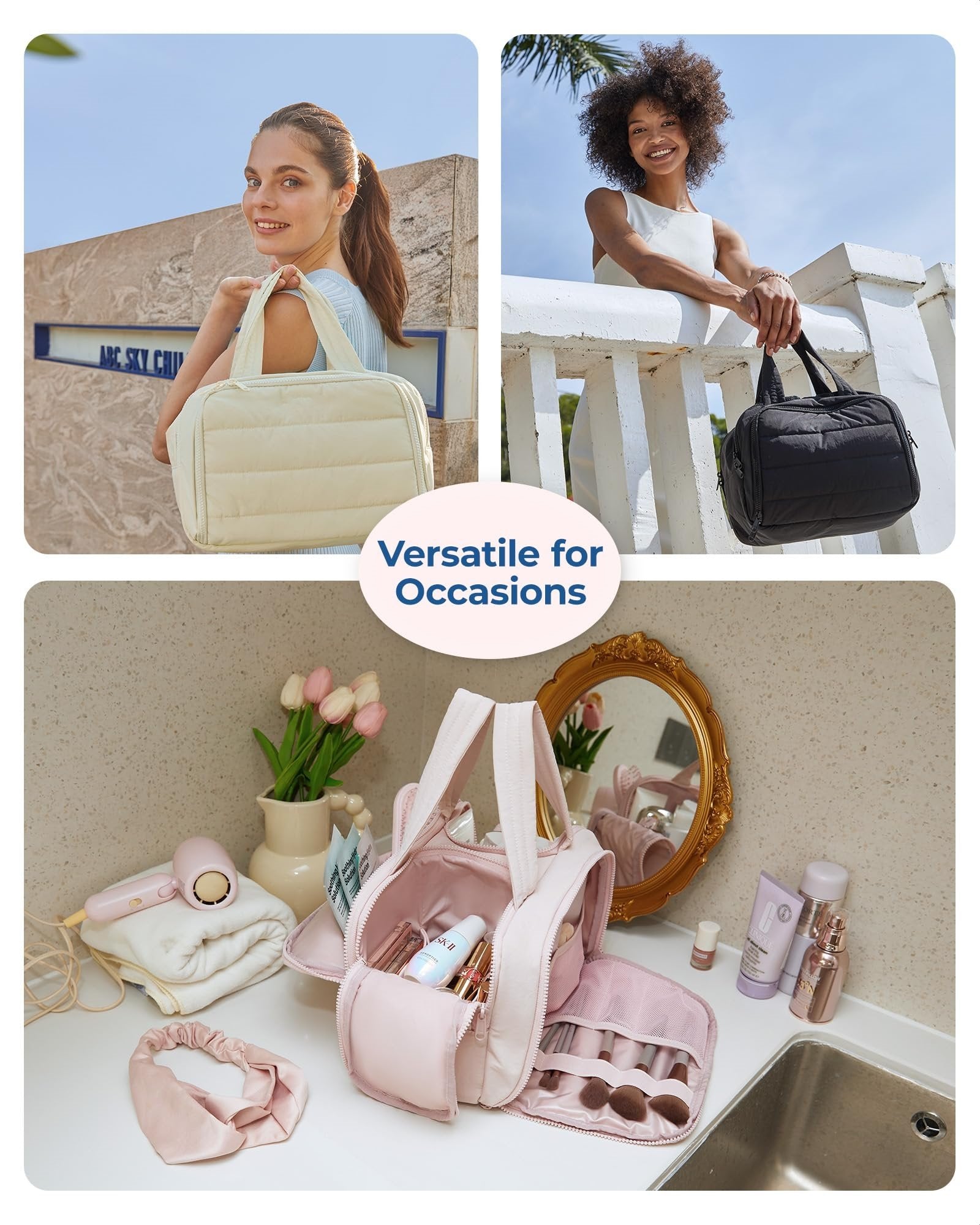 Ultra lekkie i miękkie materiały: wykonane z miękkiego i luksusowego materiału poliestrowego. Ta torba toaletowa puffer wydaje się jak waty cukrowej, dając ludziom relaksującą i wygodną atmosferę. Również niezawodna, funkcjonalna i modna torba do makijażu. Niezwykle idealny prezent świąteczny dla siebie, swojej rodziny i twojego przyjaciela.