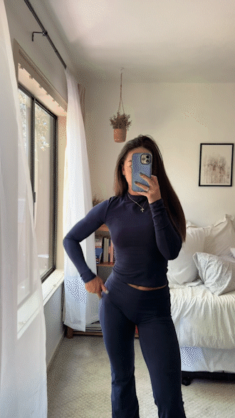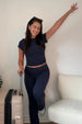 Najwygodniejszy zestaw niezbędników do salonu. Krótki top z okrągłym dekoltem w połączeniu z elastycznymi spodniami na co dzień – jest niesamowity!