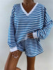 Snappy to luźny komplet dresowy, który zadba o Twoją wygodę i komfort. Będzie świetnym rozwiązaniem na długie podróże, szybką stylizacją na plażę i doskonałą opcją na kawę w ogrodzie. Całość składa się z dłuższej bluzy z dekoltem w kształcie litery V, lekko przedłużonym tyłem oraz długimi rękawami zakończonymi mankietami. Do kompletu dołączono wygodne spodenki z gumką w pasie.