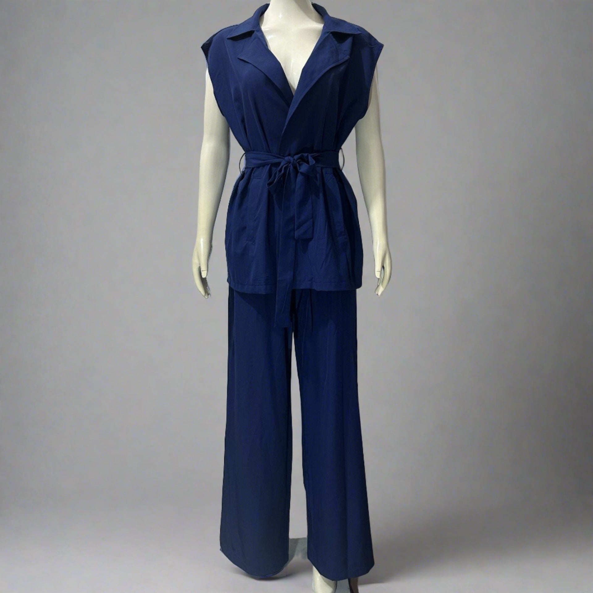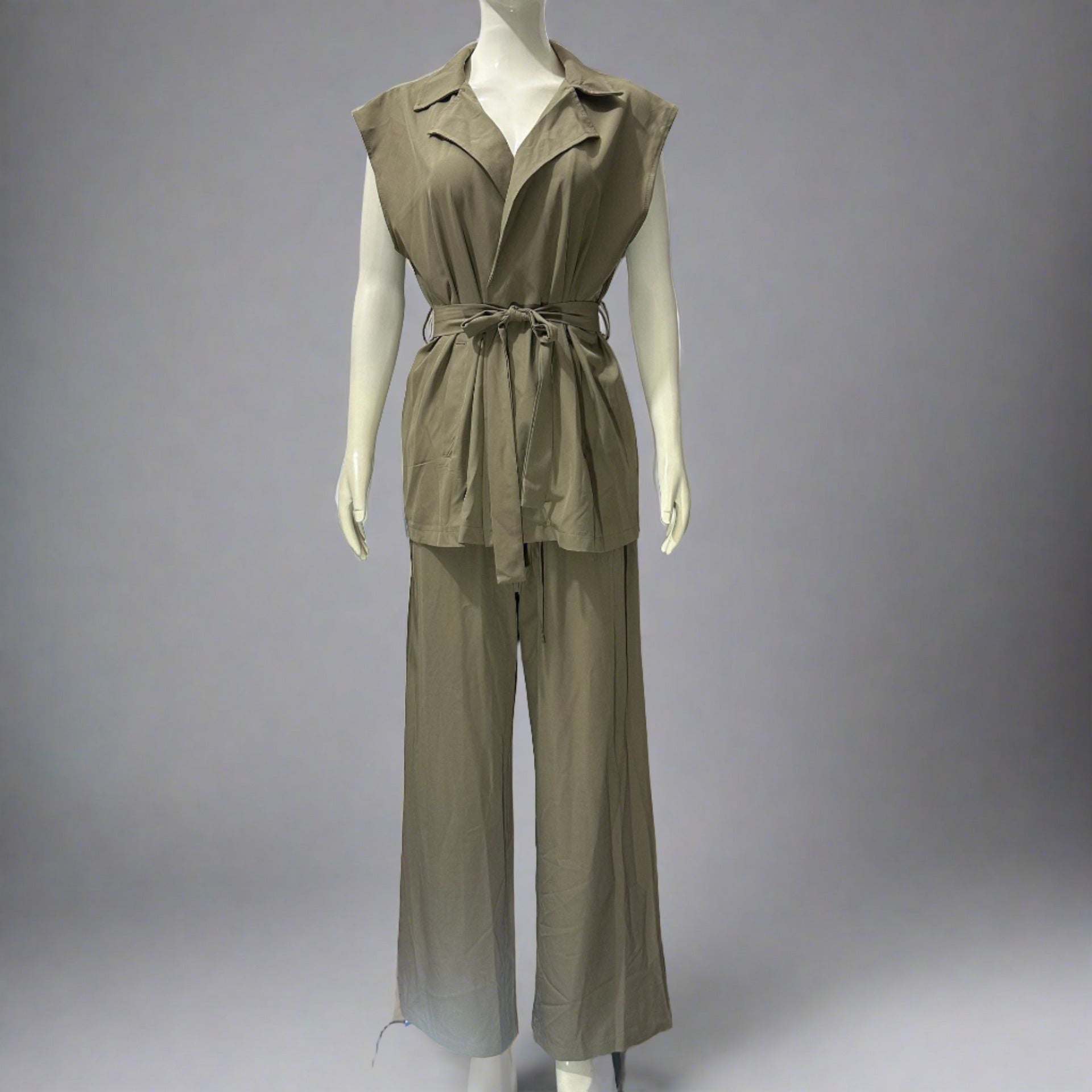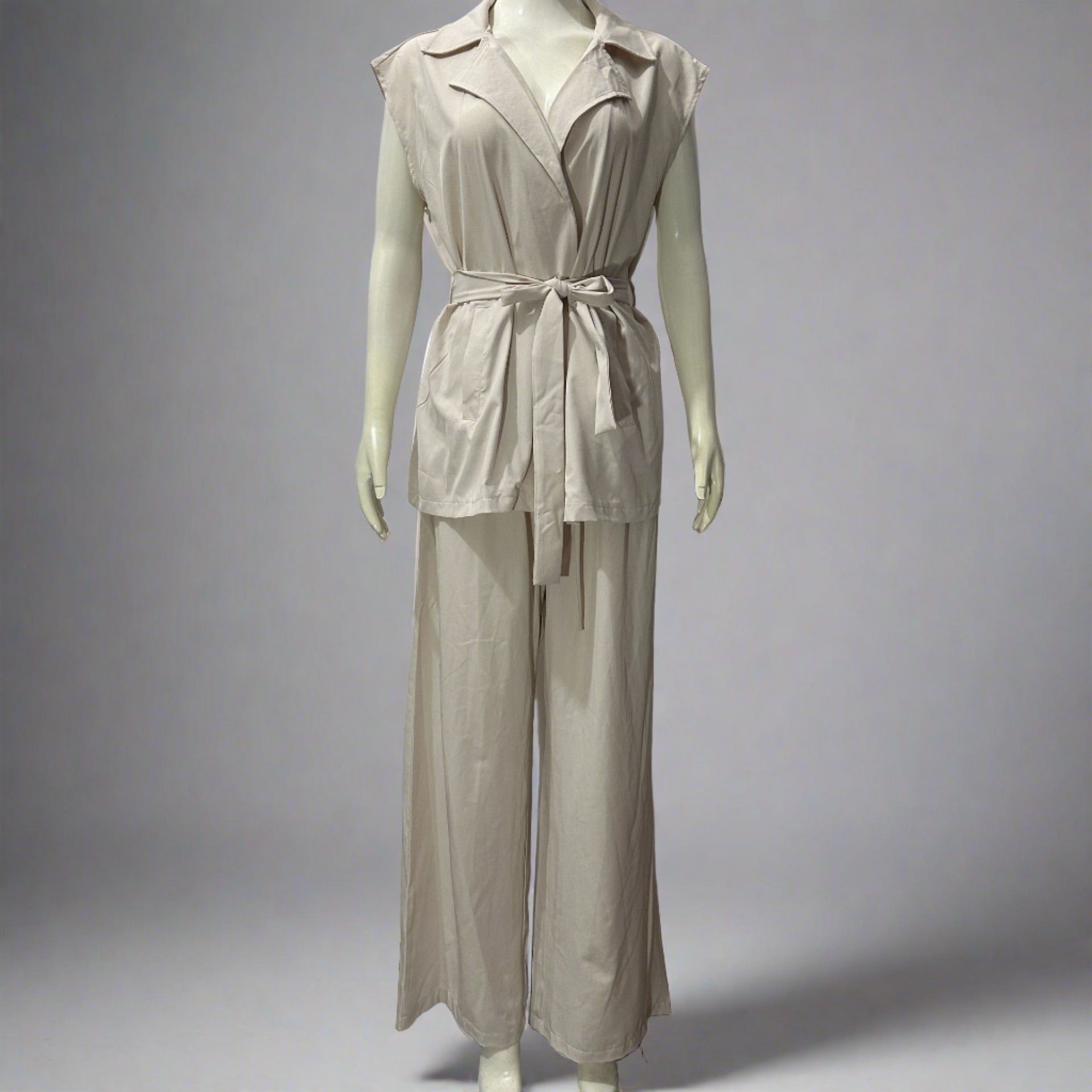 Odkryj luksusowy styl naszego codziennego stroju wiosennego, obejmującego top kimono z paskiem w połączeniu ze spodniami z szerokimi nogawkami. Ten dwuczęściowy zestaw emanuje elegancją i wyrafinowaniem, składający się ze sznurowanego kardiganu i spodni z wysokim stanem, wykonanych z solidnej tkaniny poliestrowej. Dekolt z kołnierzykiem i krój bez rękawów dodają unikalnych elementów, a wysoki stan i pełna długość spodni podkreślają sylwetkę. Wzbogać swoją garderobę tego lata dzięki temu ekskluzywnemu zestawowi, który ucieleśnia świat sztuki, literatury i mody.