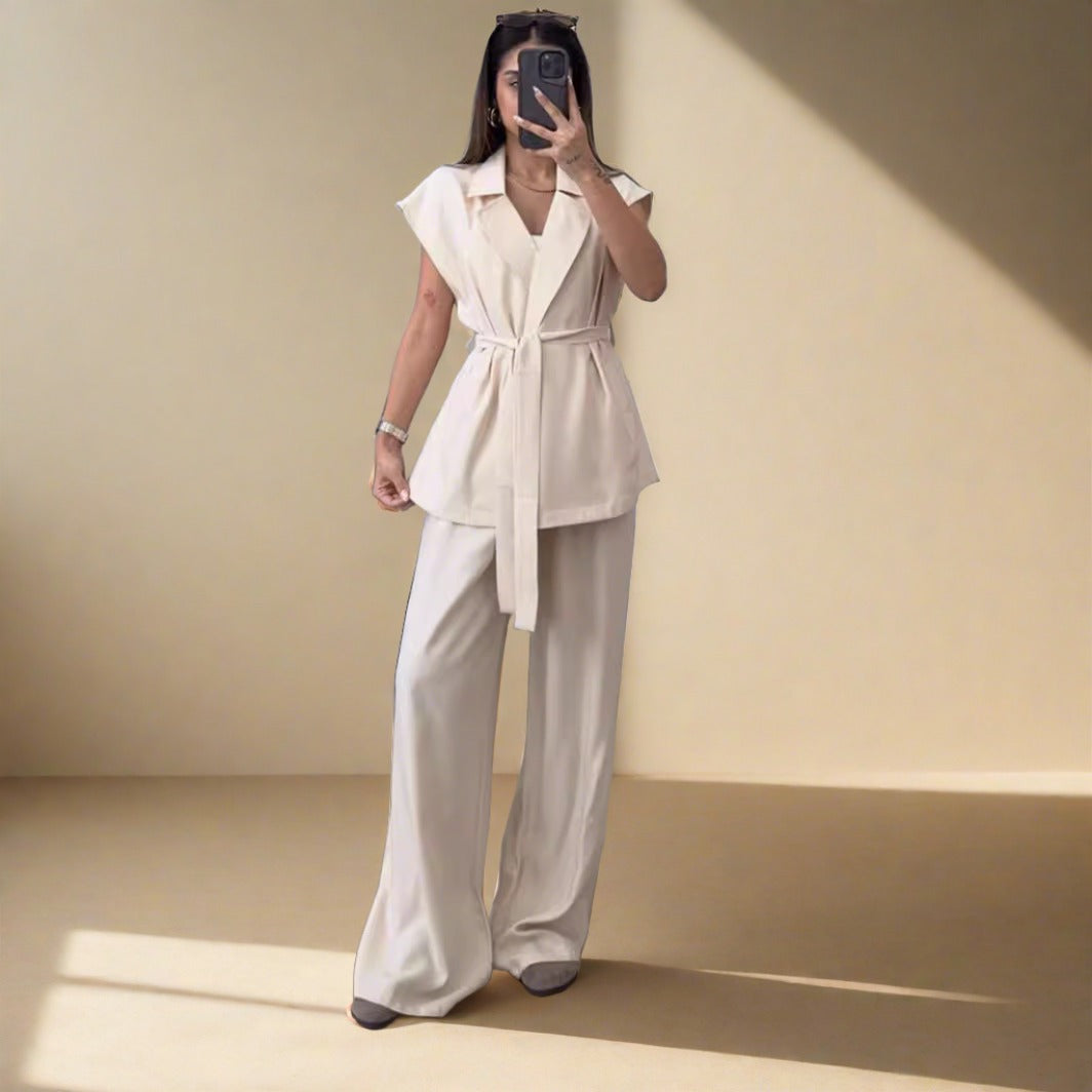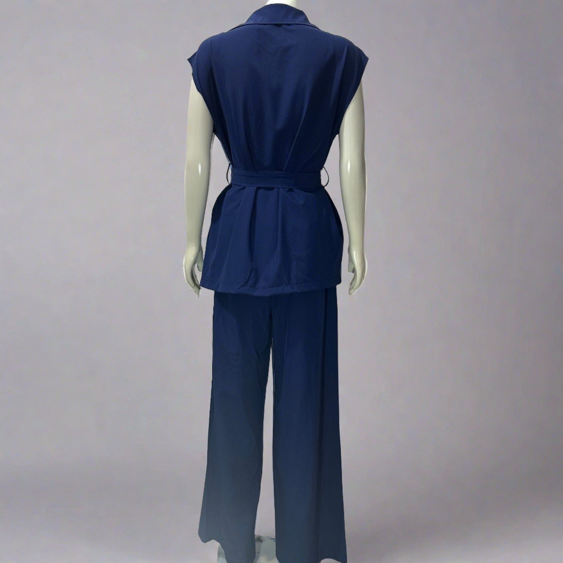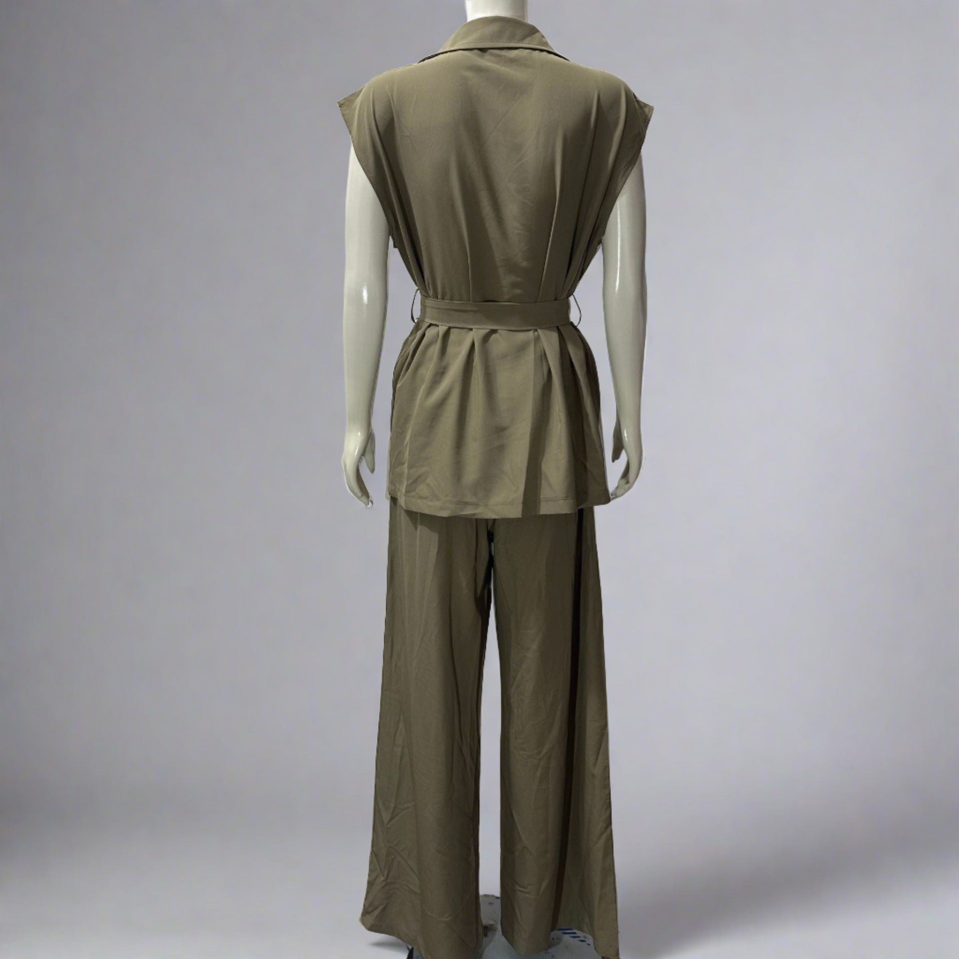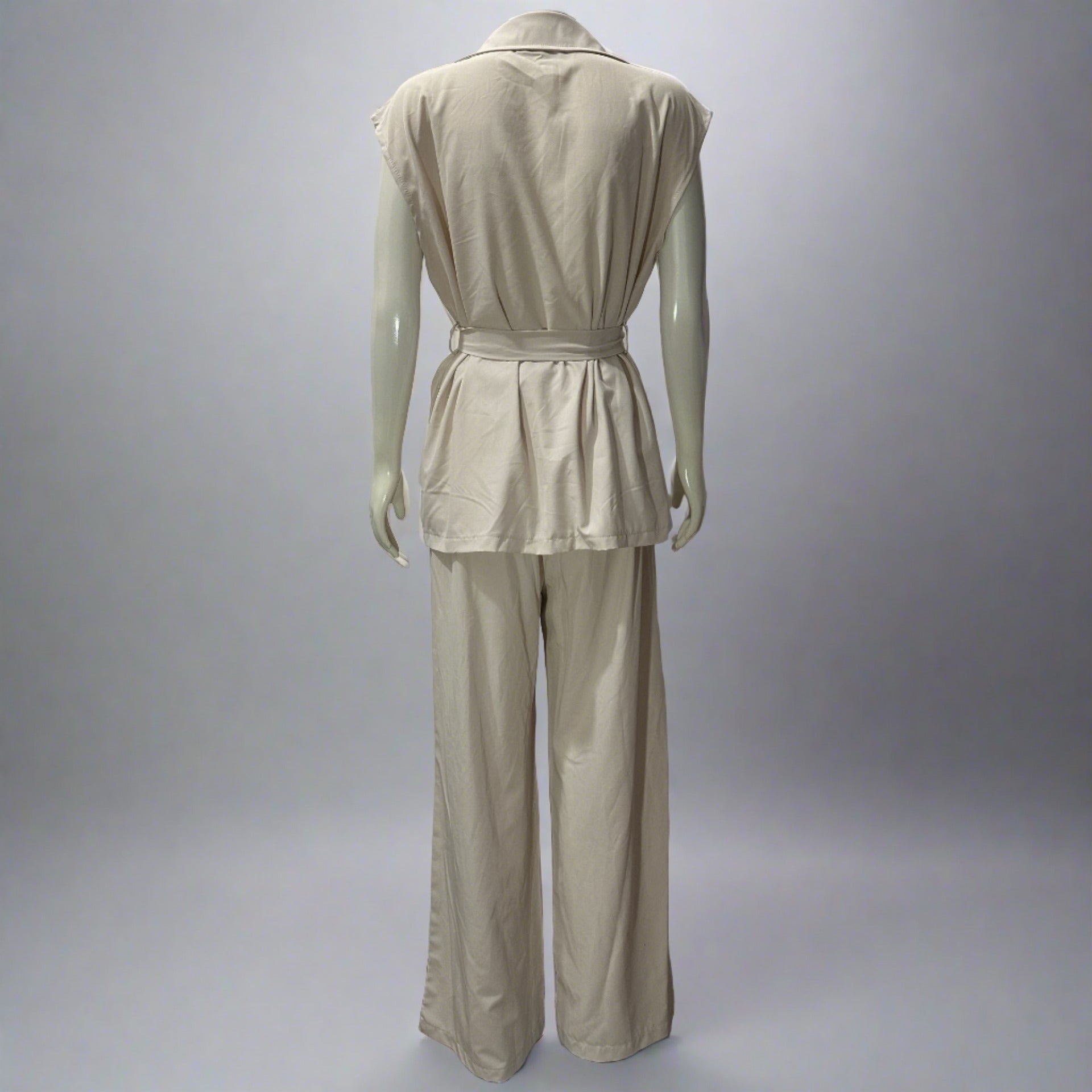 Odkryj luksusowy styl naszego codziennego stroju wiosennego, obejmującego top kimono z paskiem w połączeniu ze spodniami z szerokimi nogawkami. Ten dwuczęściowy zestaw emanuje elegancją i wyrafinowaniem, składający się ze sznurowanego kardiganu i spodni z wysokim stanem, wykonanych z solidnej tkaniny poliestrowej. Dekolt z kołnierzykiem i krój bez rękawów dodają unikalnych elementów, a wysoki stan i pełna długość spodni podkreślają sylwetkę. Wzbogać swoją garderobę tego lata dzięki temu ekskluzywnemu zestawowi, który ucieleśnia świat sztuki, literatury i mody.