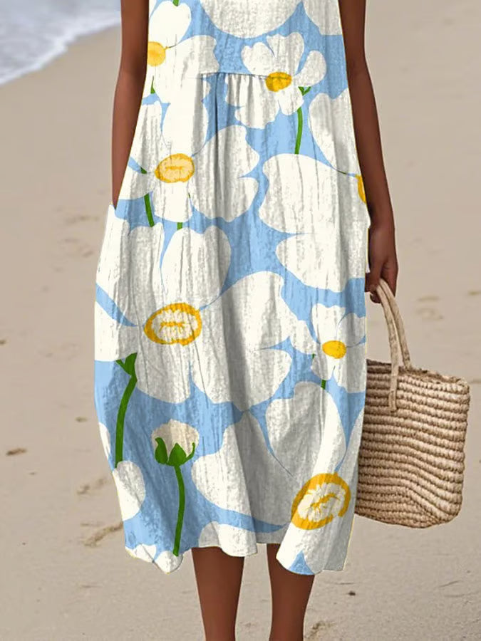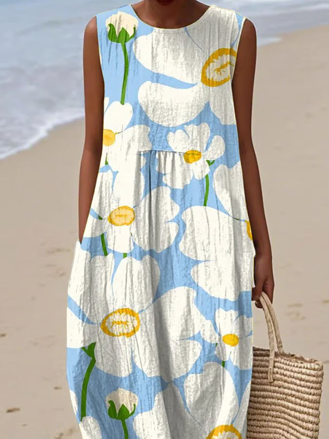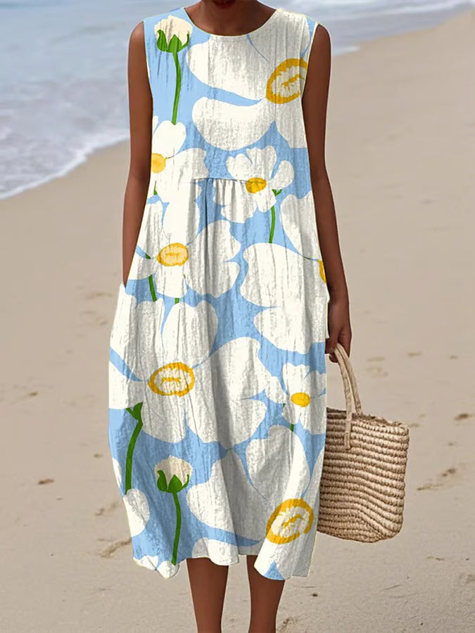 🌸 Styl: okrągły dekolt, bez rękawów, kwiatowy nadruk