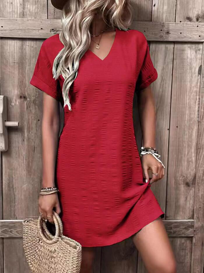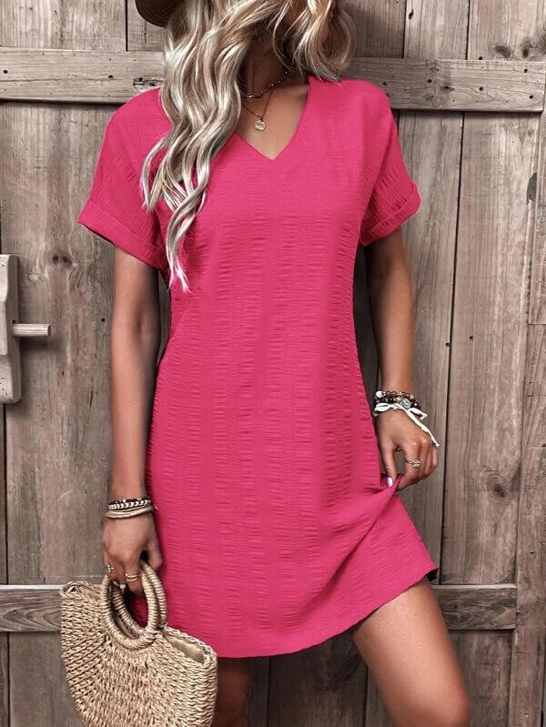 Sukienka średniej długości z dekoltem w kształcie litery V wyróżnia się szczególnie tym, że jest wykonana z niezwykle wygodnego materiału, dzięki któremu będziesz czuć się komfortowo podczas wszelkich codziennych aktywności i nie będziesz chciała jej zdejmować!