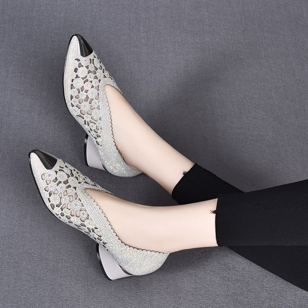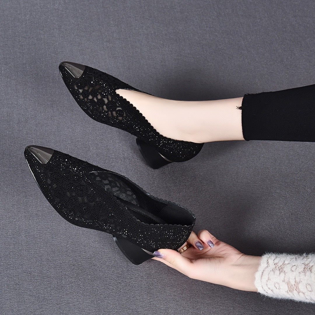 Wejdź do olśniewającego komfortu! Wyraź odważną modę dzięki naszym sandałom z wydrążonej siateczki z kryształkami i obcasom na grubym obcasie.