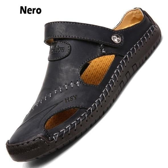 Wyściółka ze skóry dwoinowej z cienką warstwą PU. wodoodporny i odporny na zarysowania. ale nie plastik! Te sandały z zakrytymi palcami są wyposażone w antykolizyjny, gumowy podnosek, dzięki czemu stopy są bezpieczne i wygodne na świeżym powietrzu.
