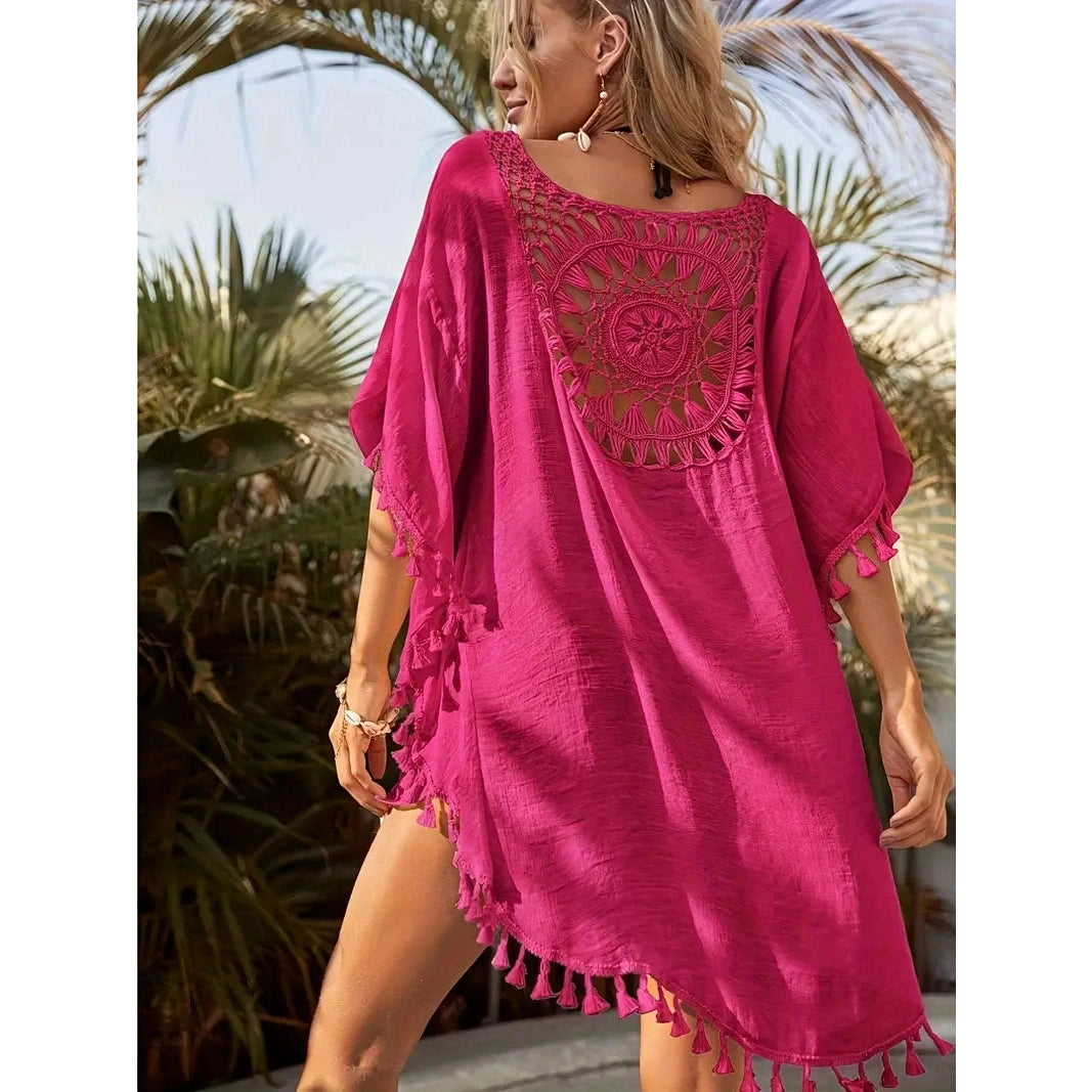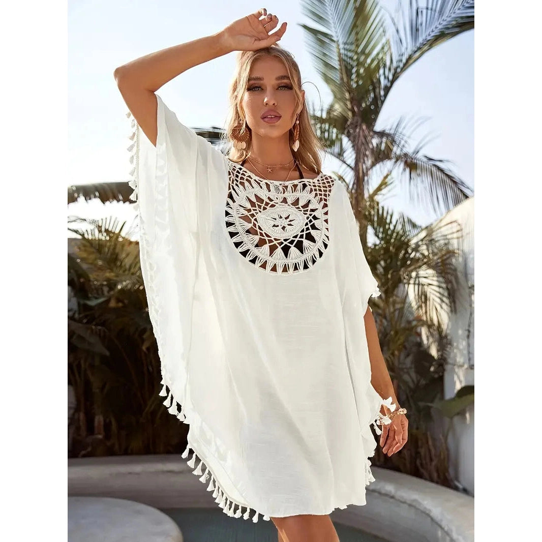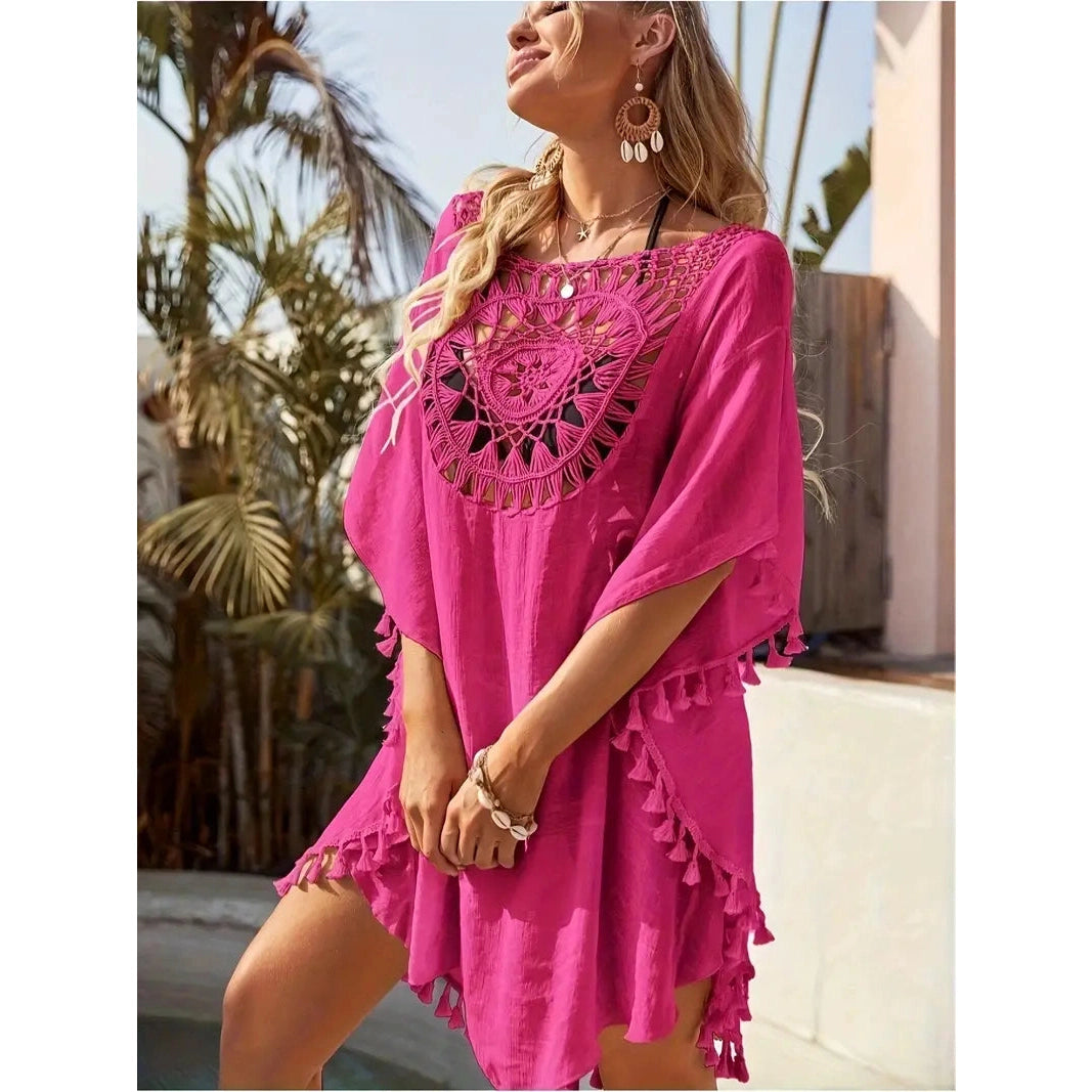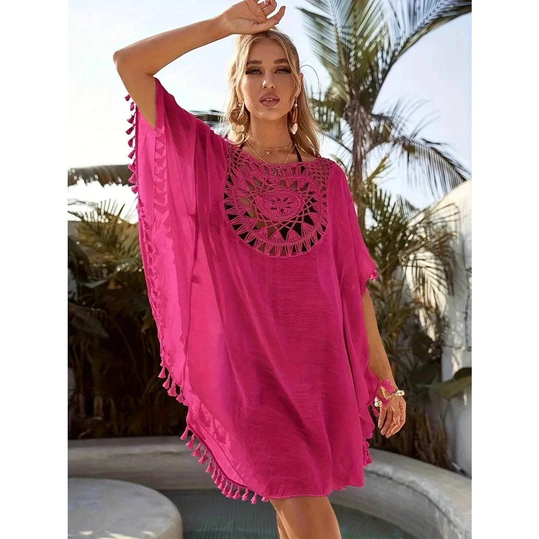 Ta żeńska koronkowa tunika jest przeznaczona dla tych, które cenią styl, lekkość i kobiecość. Wyjątkowy koronkowy wzór zapewnia subtelną elegancję, a frędzle ozdobione zabawą. Tunik wykonany jest z lekkiego materiału, który przyjemnie leży na ciele i nie ogranicza ruchów nawet w najgorętszym dniu.