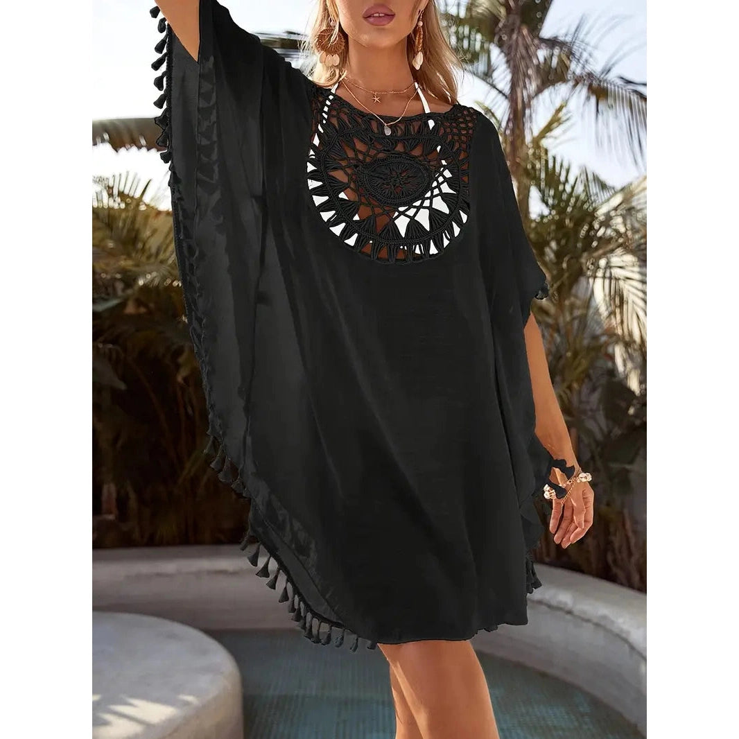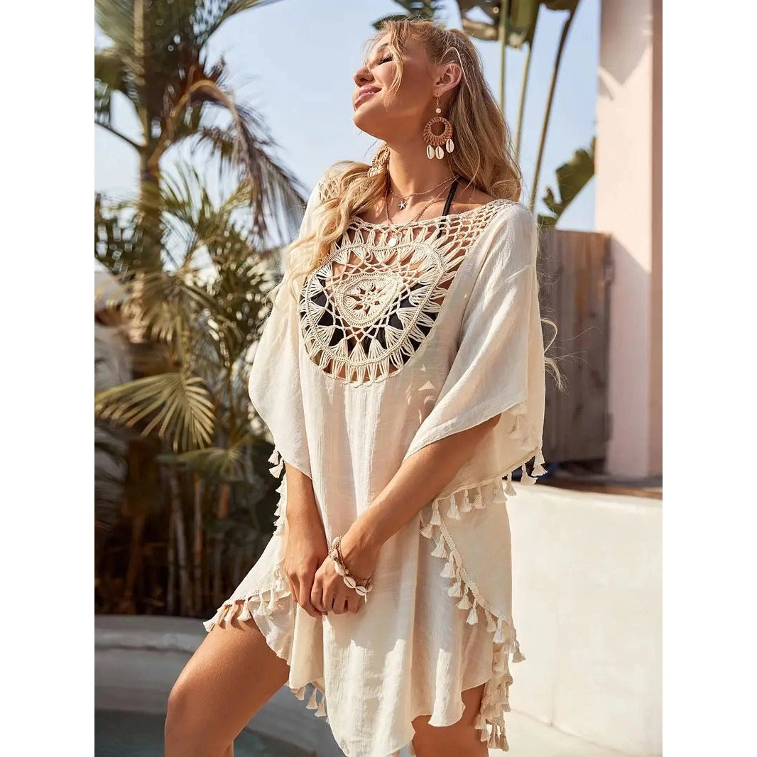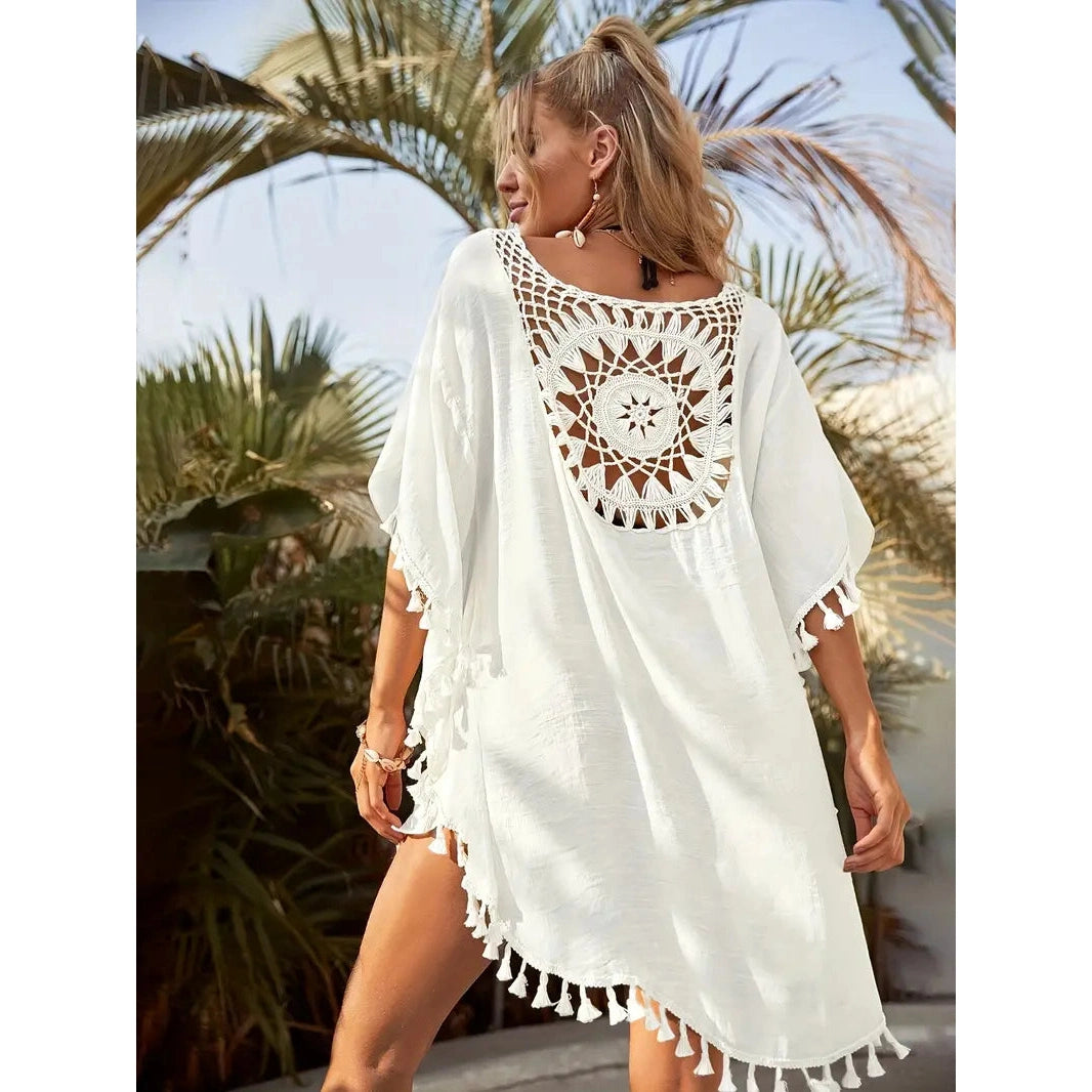 Ta żeńska koronkowa tunika jest przeznaczona dla tych, które cenią styl, lekkość i kobiecość. Wyjątkowy koronkowy wzór zapewnia subtelną elegancję, a frędzle ozdobione zabawą. Tunik wykonany jest z lekkiego materiału, który przyjemnie leży na ciele i nie ogranicza ruchów nawet w najgorętszym dniu.