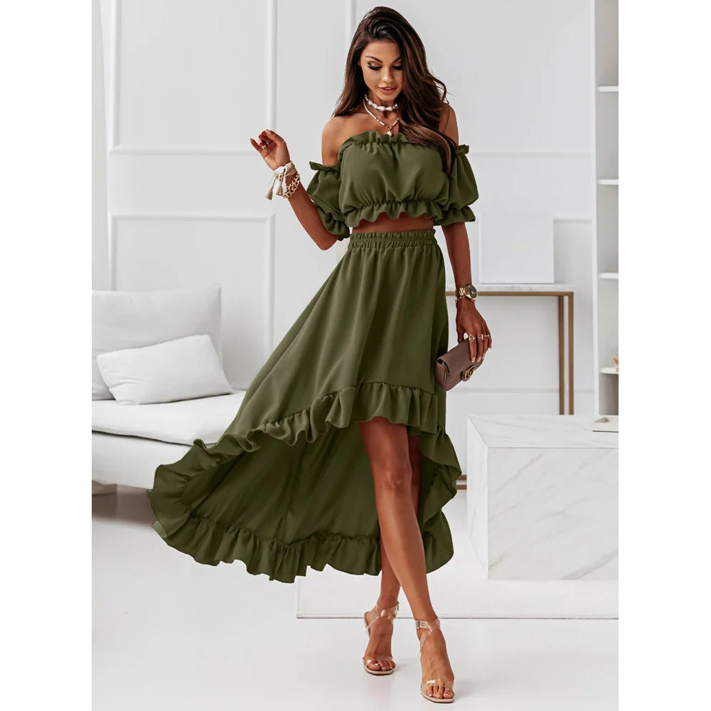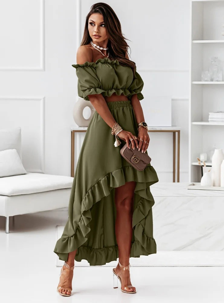 Jeśli szukasz casualowego stroju, ten komplet ze spódnicą z dekoltem w łódkę i falbanką jest właśnie dla Ciebie! Nasz wyjątkowy komplet ze spódnicą z dekoltem w łódkę i falbanką z pewnością doda Twojej garderobie odrobinę stylu.