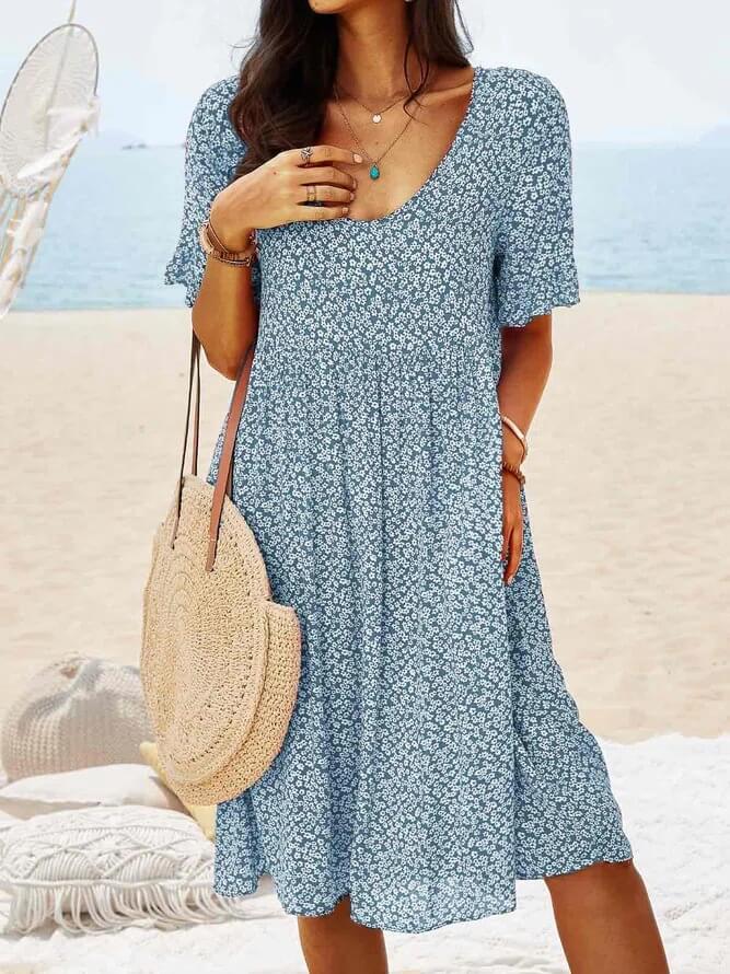 Uroczy kwiatowy wzór i boczne kieszenie dodają uroku tej sukience. Super szlachetna i piękna sukienka z luźnym wzorem i huśtawkowym dołem, obowiązkowa sukienka w Twojej garderobie! 5 prostych, jednolitych, ale pięknych kolorów, można ją po prostu nosić z kilkoma elementami dekoracyjnymi. S-5XL, rozmiar Plus i długość są odpowiednie i odpowiednie dla wszystkich kobiet.