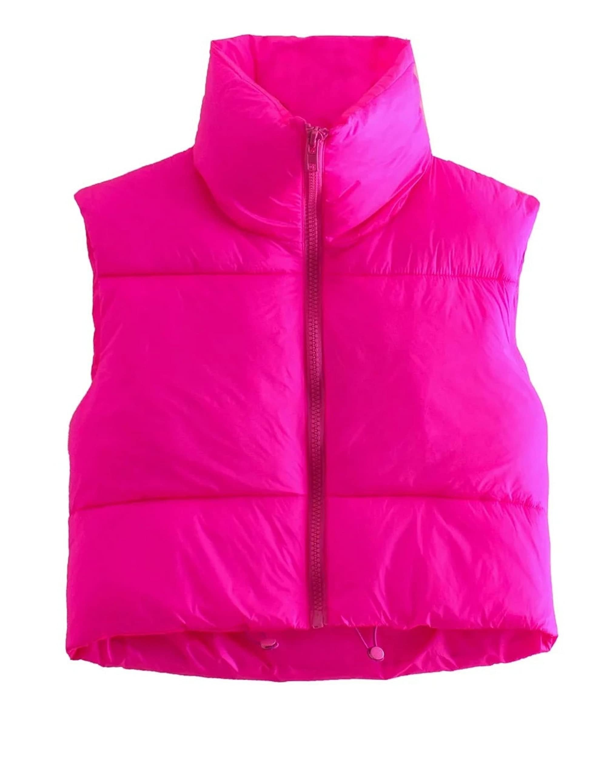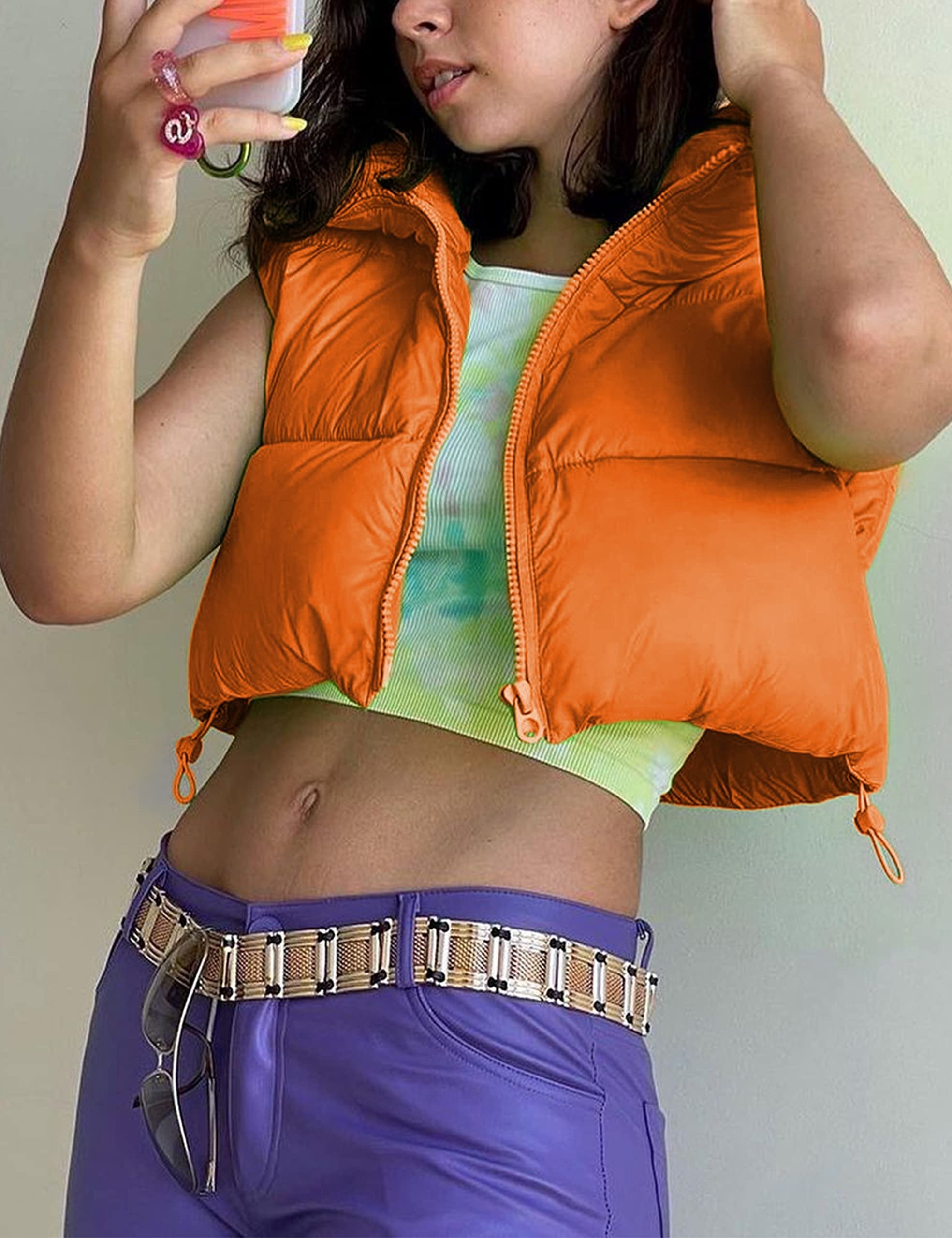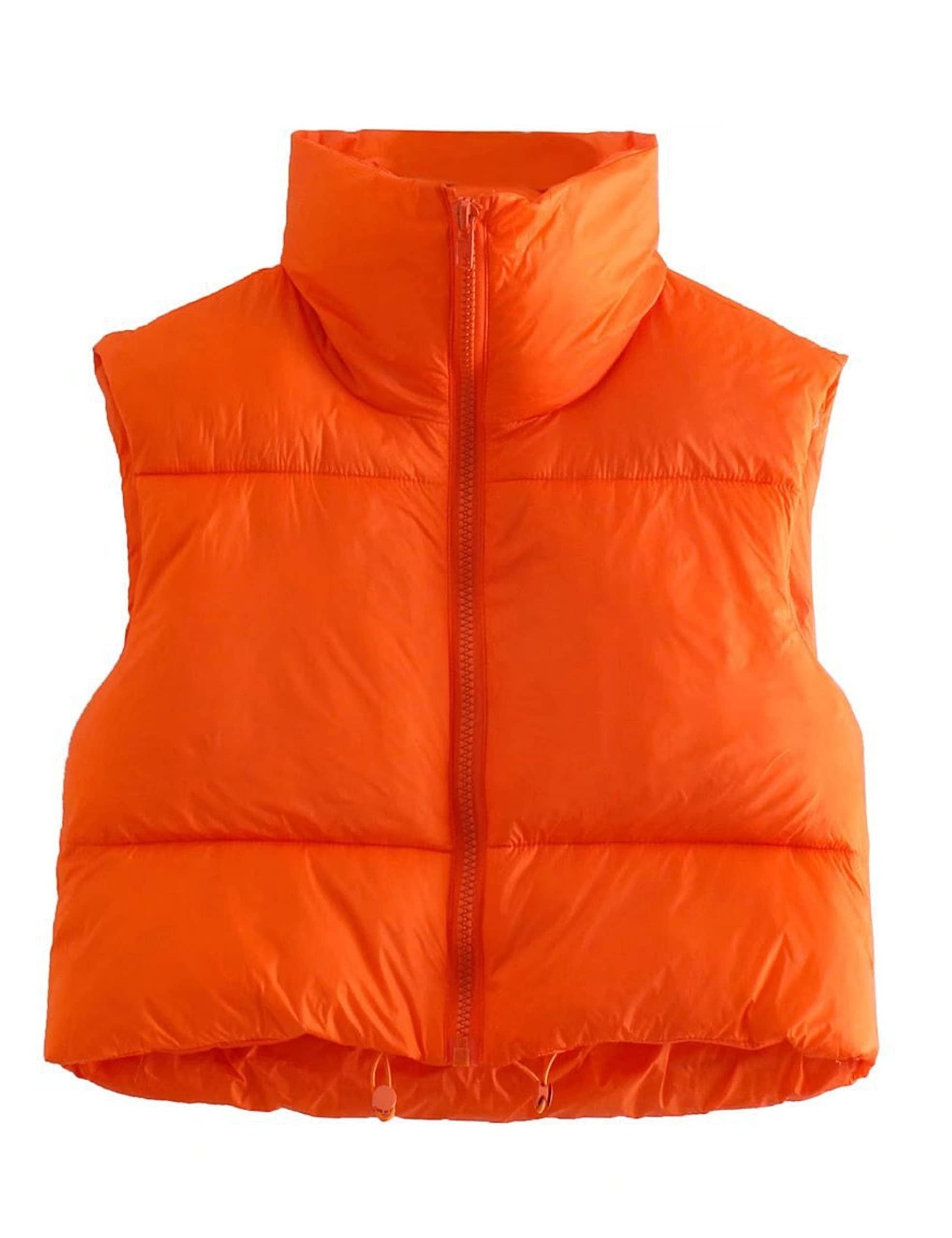 Damska krótka kamizelka puchowa. Do wyboru są kolory brązowy/czarny/biały/pomarańczowy/khki/zielony/gorący róż/czerwony/zieleń wojskowa/fioletowy/Hazeblue!
