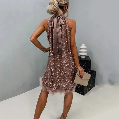 Pakiet zawiera: 1 * Damska elegancka cekinowa sukienka wiązana na szyi z piórkowym obszyciem
