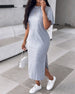 WSZECHSTRONNY ROZDZIELONY Krój - wyróżniającą się cechą tej sukienki jest stylowe rozcięcie z boku, które dodaje nowoczesnego akcentu klasycznej sylwetce T-shirtu. Rozcięcie zwiększa atrakcyjność wizualną sukienki, zapewniając jednocześnie większą mobilność i wygodę. Tworzy pochlebną sylwetkę, która wydłuża nogi i zapewnia przewiewny, zrelaksowany krój.