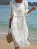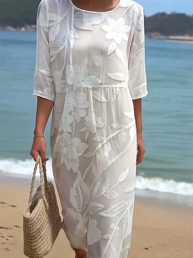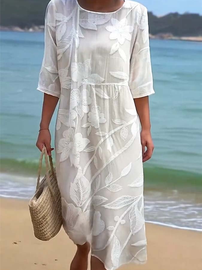 Damska sukienka casualowa z okrągłym dekoltem i średnim rękawem, z nadrukiem z bawełny i lnu