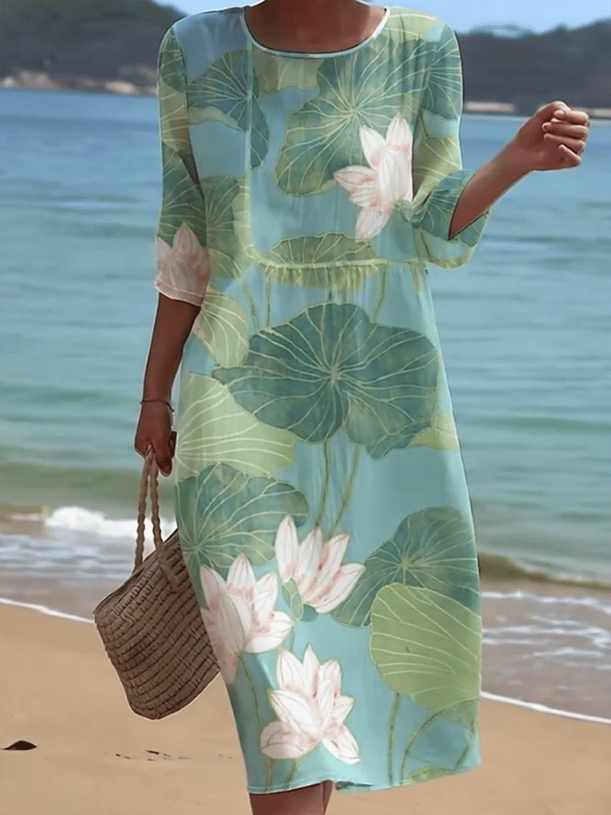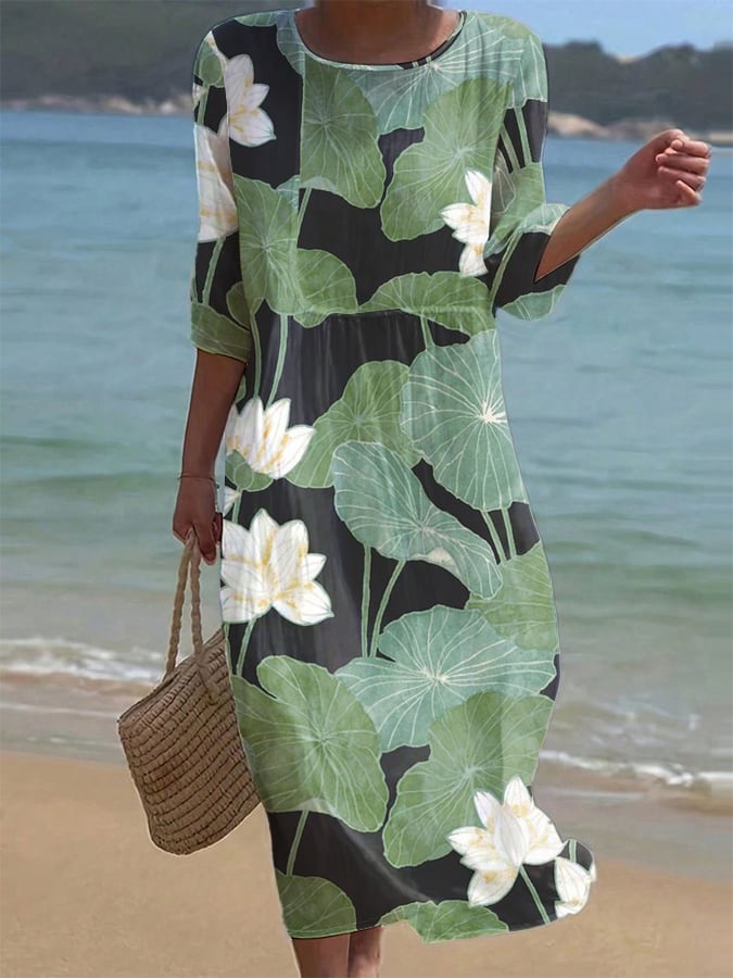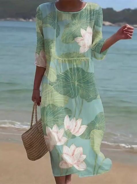 Damska sukienka casualowa z okrągłym dekoltem i średnim rękawem, z nadrukiem z bawełny i lnu