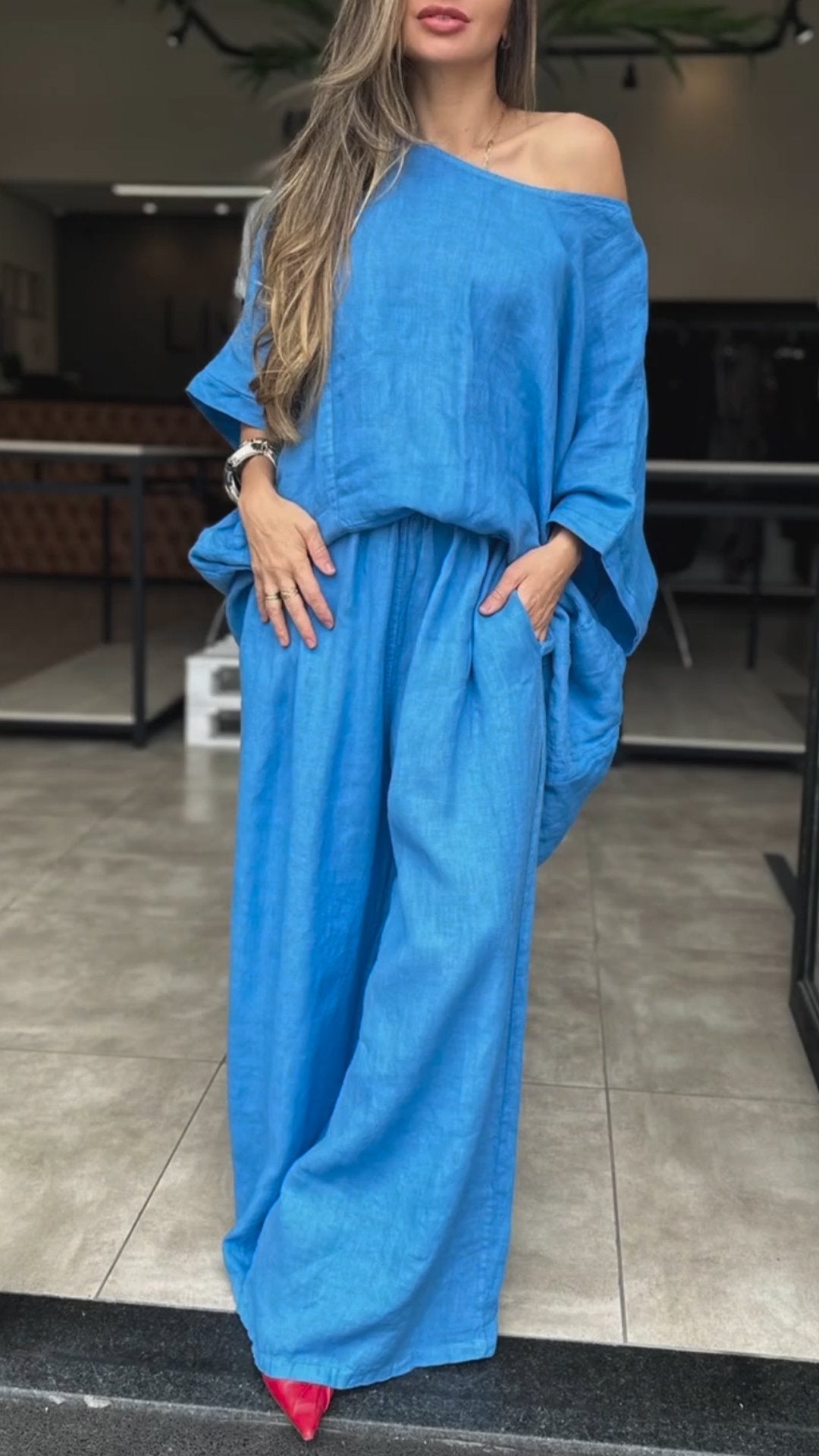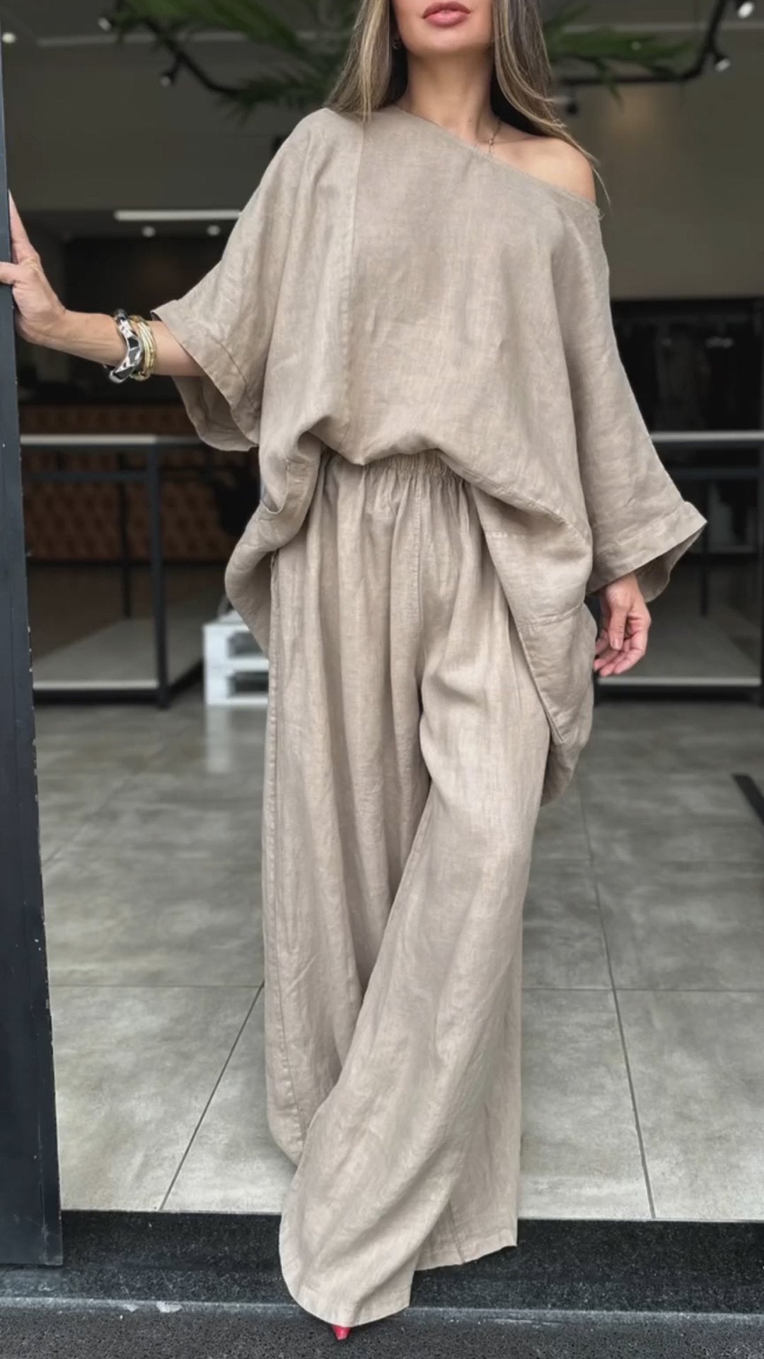 Damski, luźny garnitur z bawełny i lnu, z okrągłym dekoltem