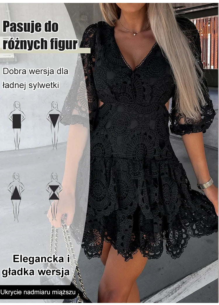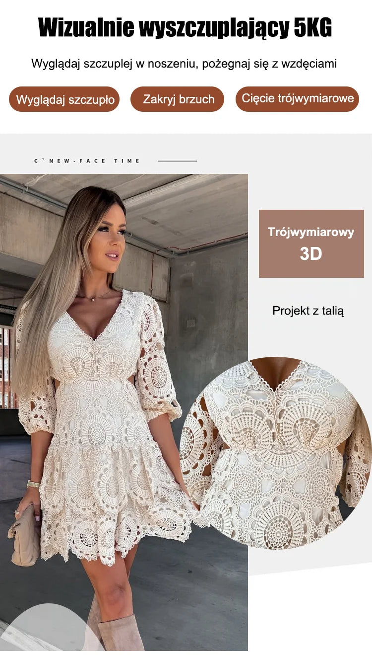 Wyszczuplejąca sukienka z dekoltem w szpic, talią i koronkowym rąbkiem